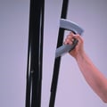 Gray handle with a trigger. Trigger squeeze releases mechanism to slide up and down on track channel